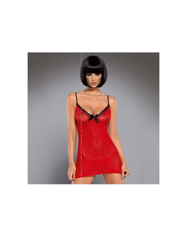 Vestido muy coqueto translúcido decorado con corazones de terciopelo, lazo de raso entre las copas, encaje en el escote, y una cinta en la parte superior. Copas con aros. Tirantes ajustables.