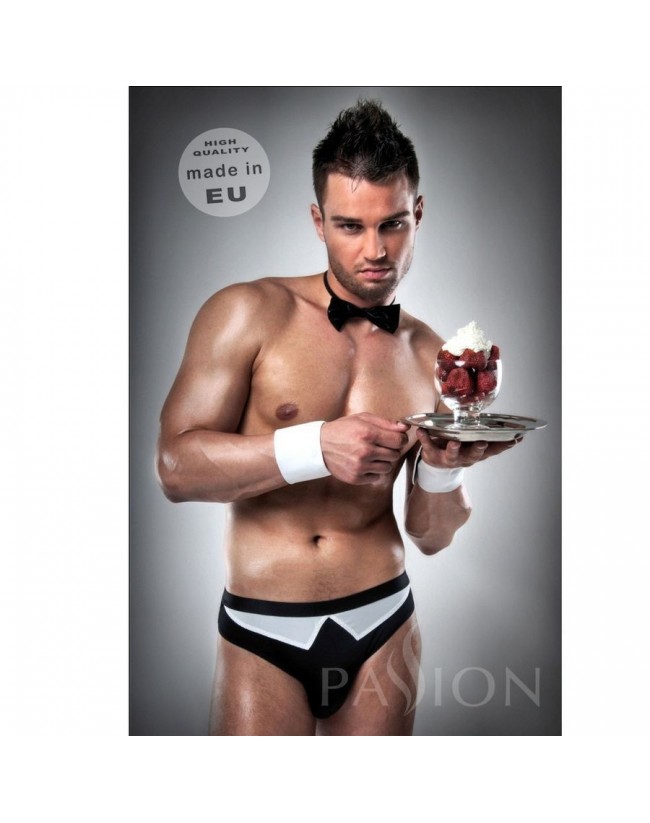 Disfraz camarero sexy en negro y blanco compuesto por pajarita superior y slip inferior. ideal para momentos especiales llevando al limite tus fantasias sexuales de la coleccion Passion Lingerie Men.