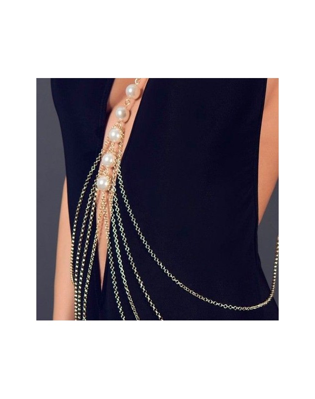 Un collar exquisito para el cuerpo, dorado, con cadenas de diferentes tamaños, que se unen junto al pecho con perlas redondas. Tiene cierre ajustable en la parte posterior. Una idea original para embellecer un vestido o destacar el cuerpo con clase y elegancia.