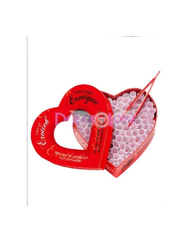 ¡Más de 100 pruebas llenas de pasión! Un juego que estimulará tús sentidos y los de tú pareja. ¡Vivid vuestro momento más intimo! Viene en una cajita de cartón duro en forma de corazón con 100 pruebas y unas pinzas. Idiomas inglés y castellano.